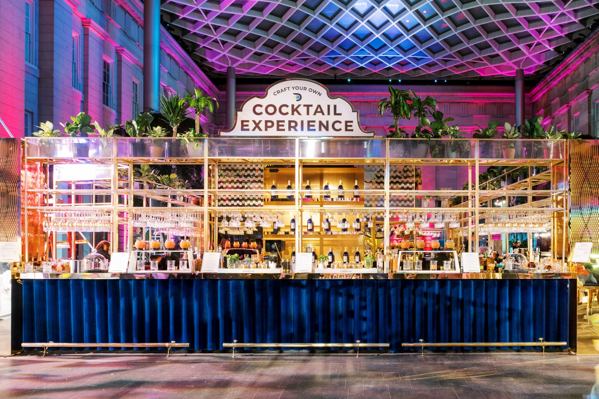 bar displays with PUNCH BOWLS and SMOKING cloche. Strolling champagne cart.